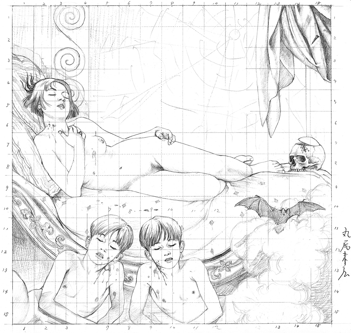 以前我在画板上画图的时候,会像这样利用方块画出粗略的草稿。编辑看到后很是惊讶,但这其实是一种很普通的方法,早就有了。现在我是在稍薄的画纸上画彩图,可以映描出草稿,所以就不再画方块了。