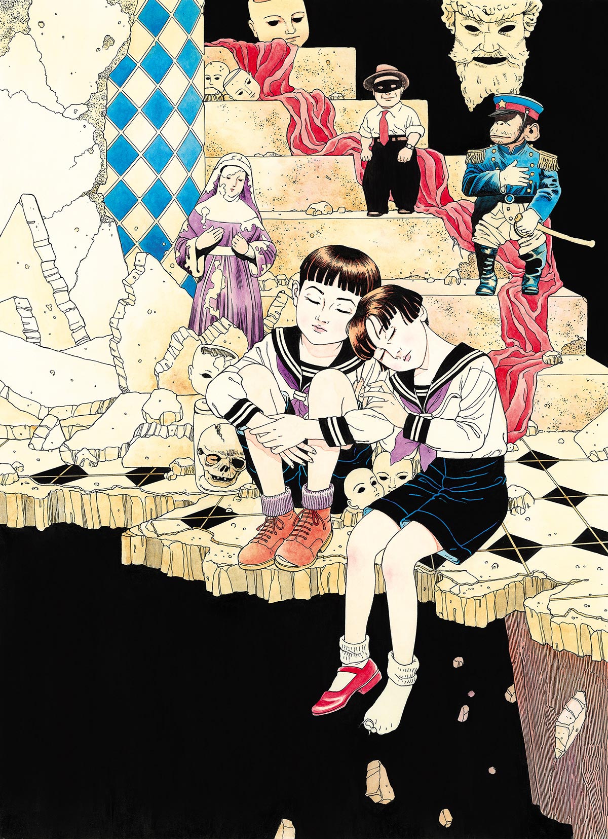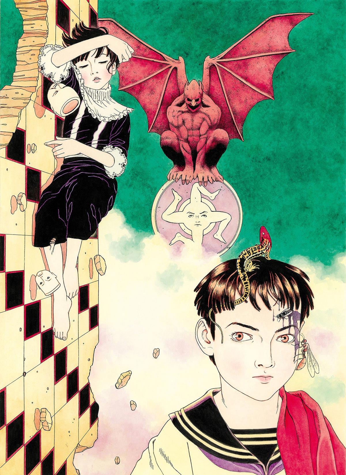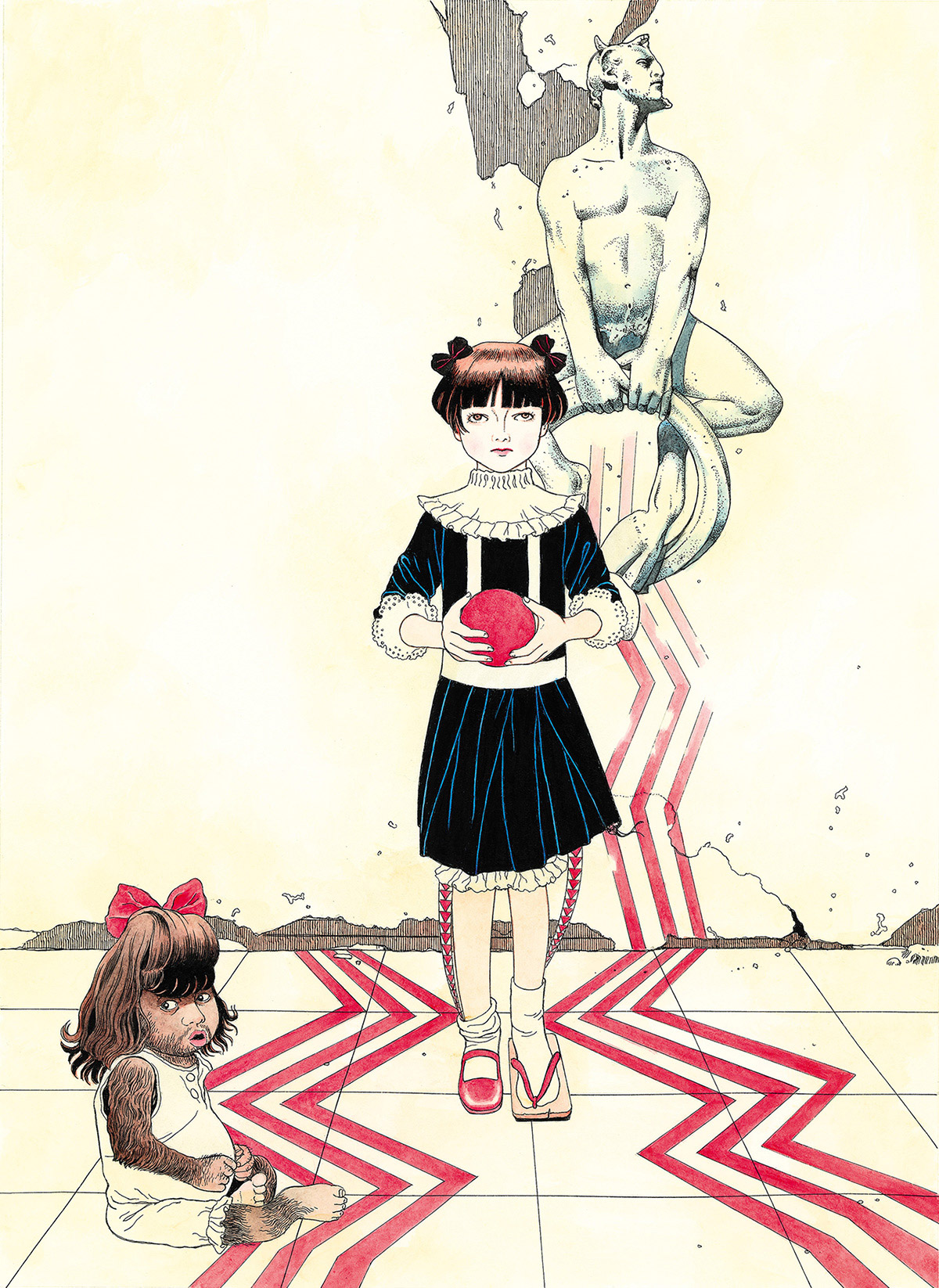 在此,我们将介绍《天國 パライゾ》收录的作品,另外还将介绍近年来他最主要的活动阵地《月刊Comic Beam》(KADOKAWA)上相关商品的原画,以此为40年回顾之旅画上句号。无须多言,我们看到的这40幅画只是丸尾艺术生涯中很小的一小部分。以这些作品为起点,我们希望大家能深刻领略到横跨40年的丸尾末広世界,以及面向50周年的他,接下来将会创造出的新天地。