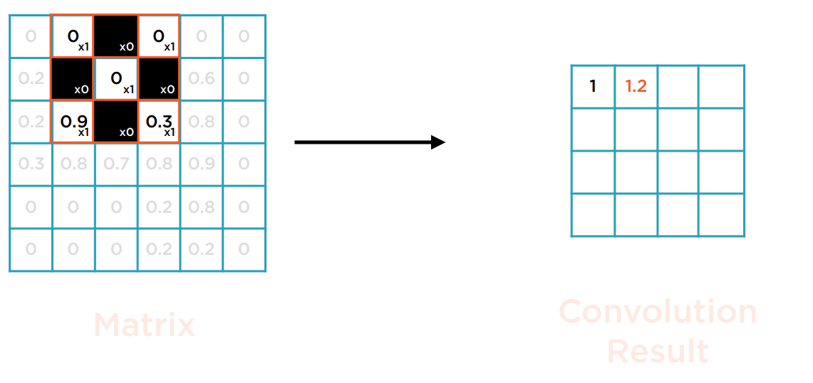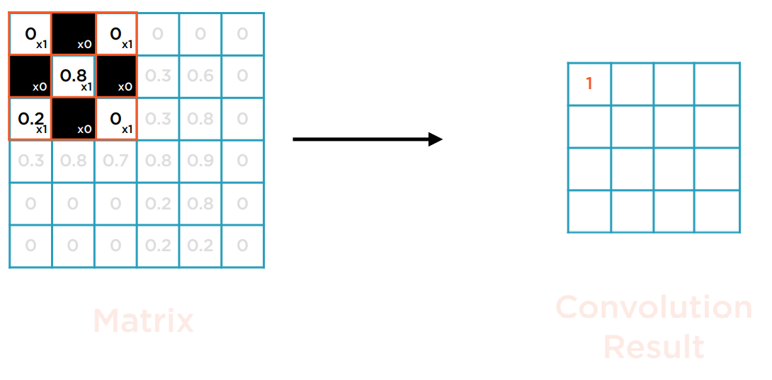 先把Kernel对齐置于矩阵的左上方,进行矩阵的点积运算。点积运算即为每个位置相同的元素的乘积的总和,为一个数。这里大多数格子都为0,只有0.81+0.21=1。