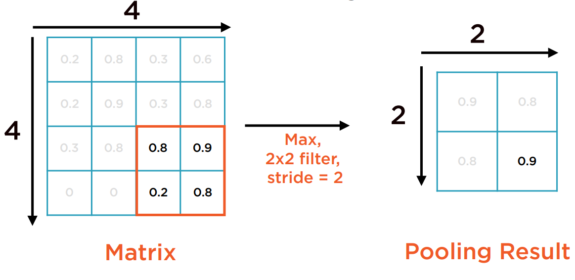 在Feature map矩阵上,再执行一个固定大小的滑动窗口函数,仅计算被框住的子矩阵中的聚合函数(如最大值、平均值、求和等)作为输出。如下图所示: