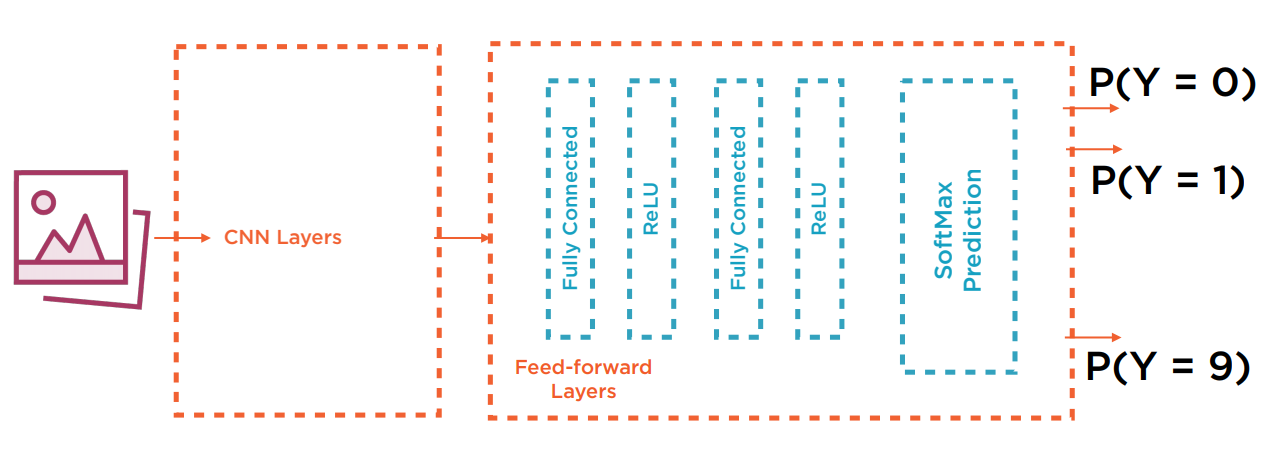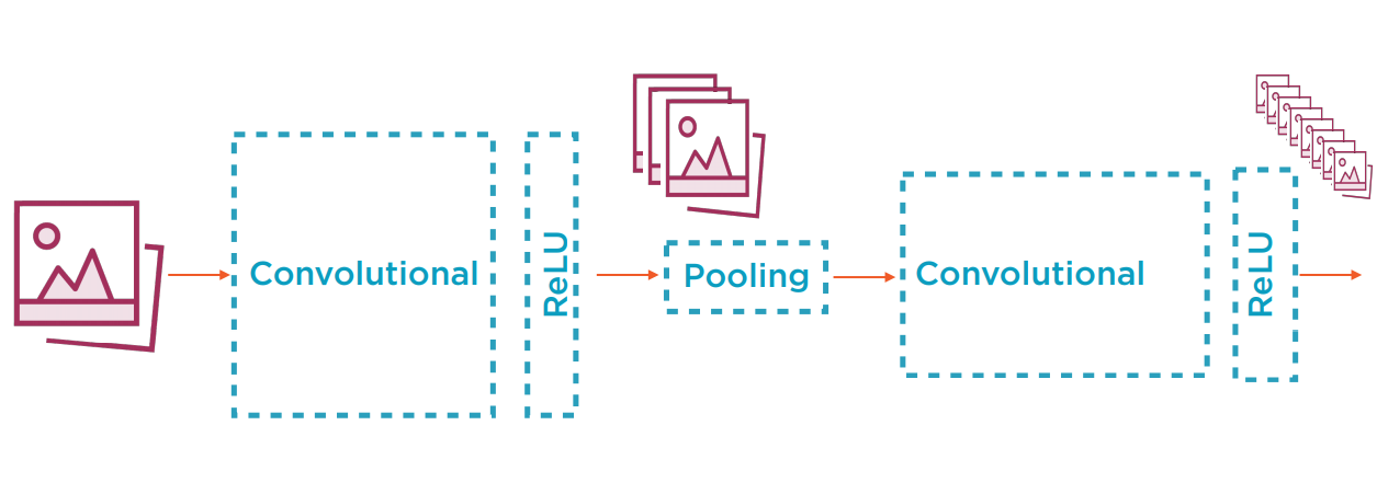 每张图片作为输入,先经过一组卷积层,生成了若干尺寸略小的Feature maps(若有Zero padding则尺寸相同)。通常再通过一个非线性的ReLU层,然后经过Pooling层尺寸减半。如此往复,随着层数越深,生成的Feature map就越多且越小。在最后,接传统的全连接神经网络作为输出。