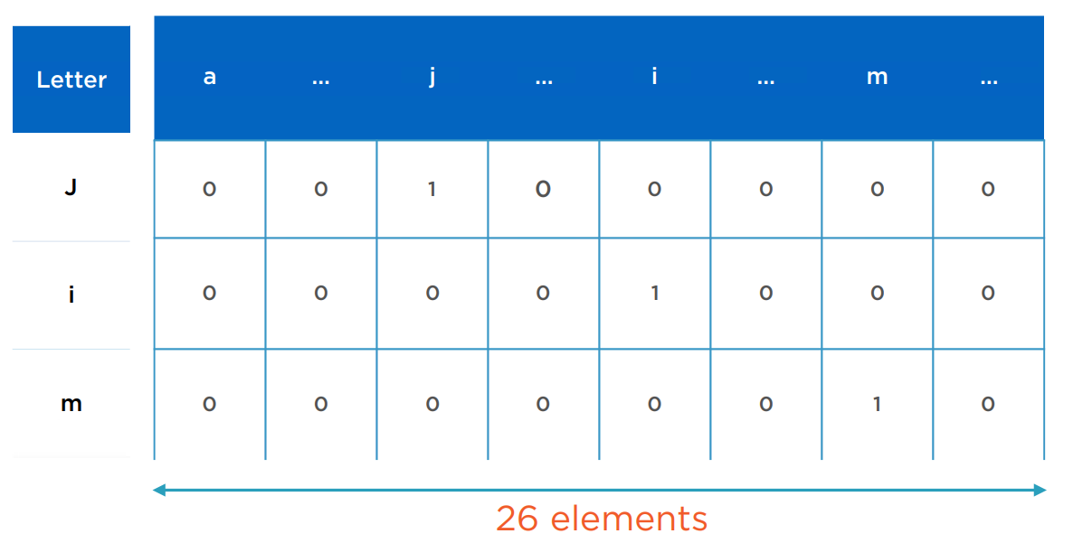 为了简化问题,假定只考虑英文26个字母表示的名字。每个字母使用如下one-hot的向量表示。
