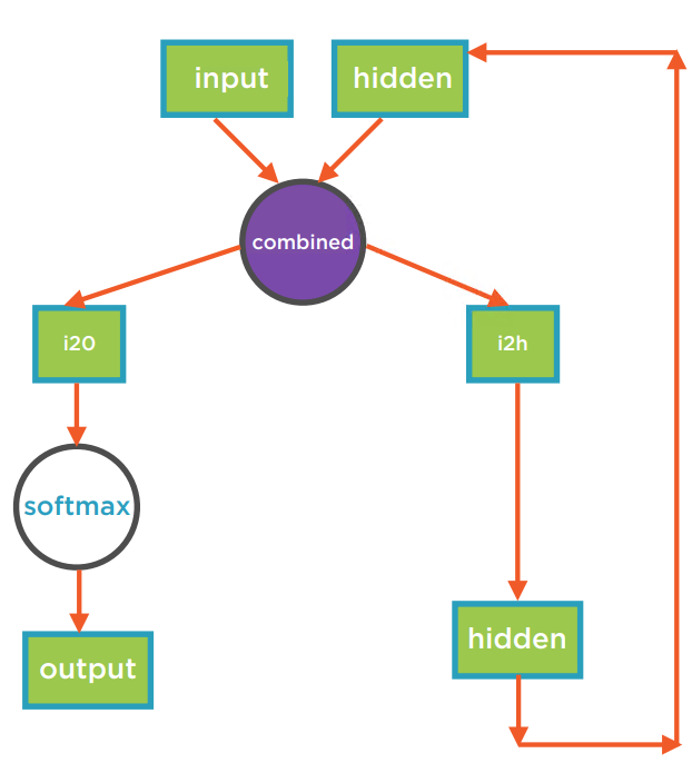 图中Input为单个字母,Tensor尺寸等于字母表的大小,因为每个字母都使用字母表大小的one-hot向量表示。Hidden Tensor的尺寸定为256。Combine Tensor为简单的连接操作的结果,尺寸变为2者之和。Combine通过2个层,一个输出为预测结果,另一个输出成为输入下一个序列的Hidden Tensor。因此这个过程支持对键入的每一个字母作一次预测,随着键入的字母串越长,预测得就越准确。