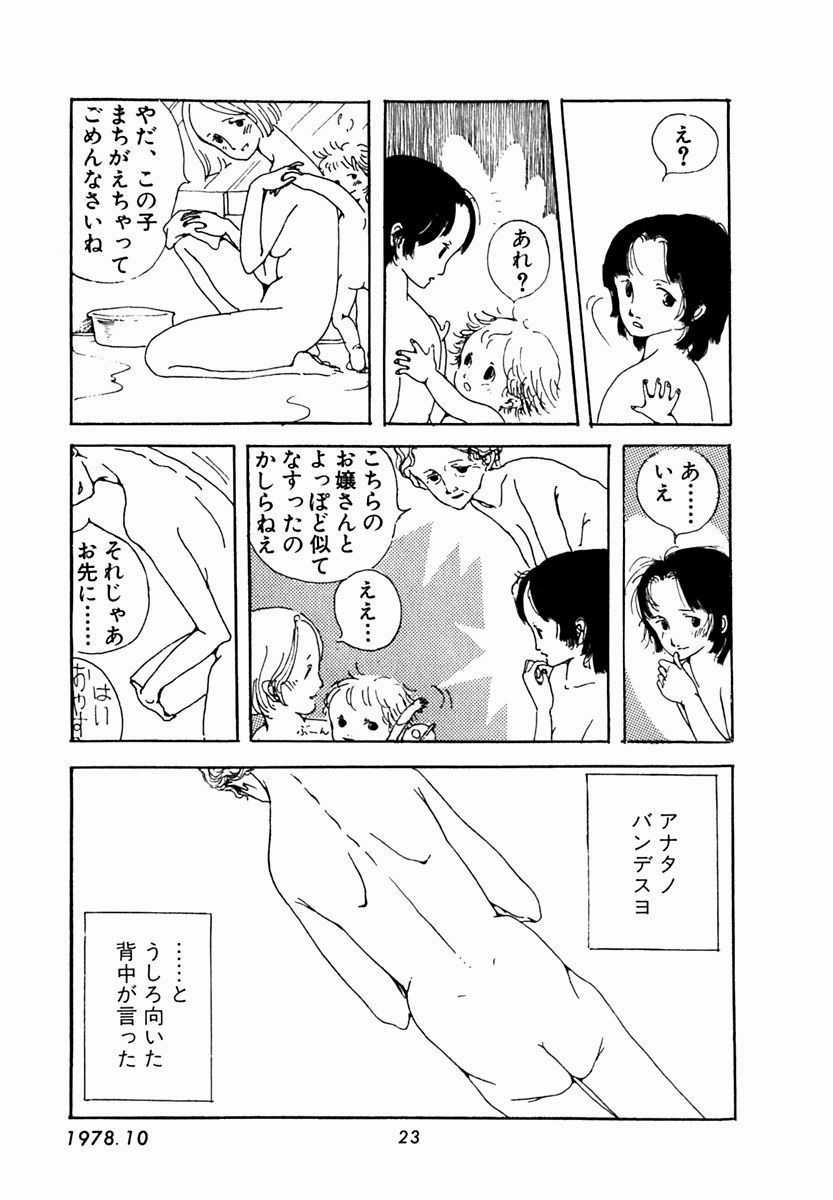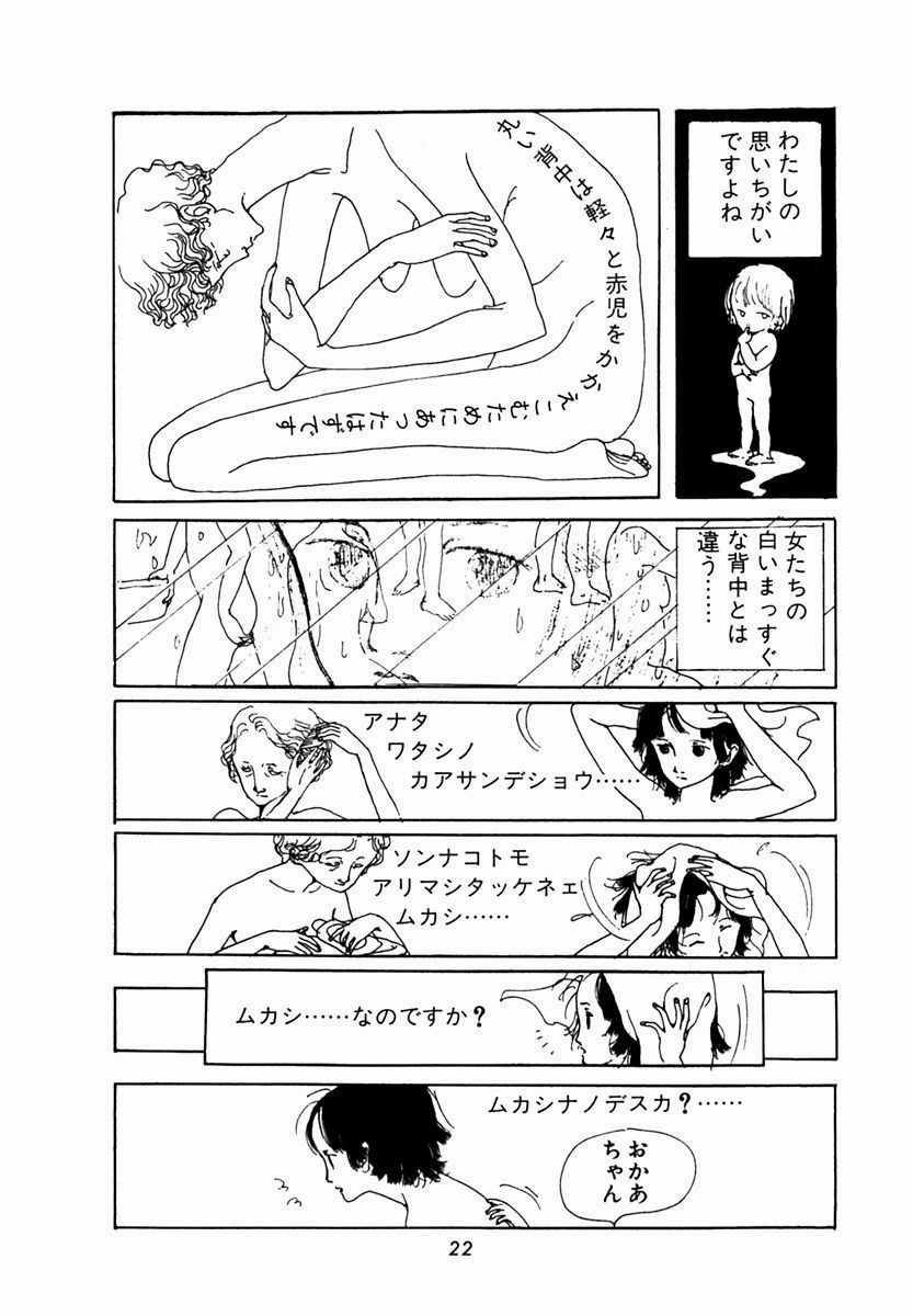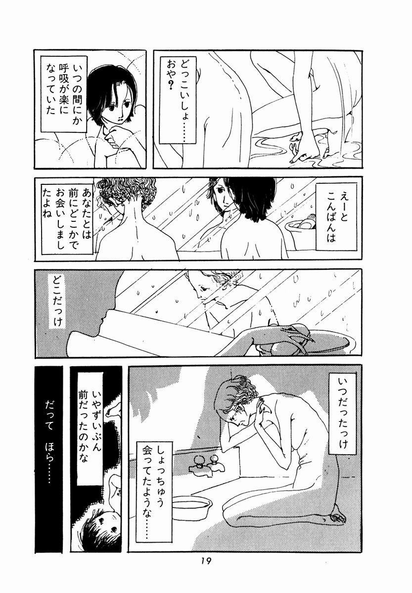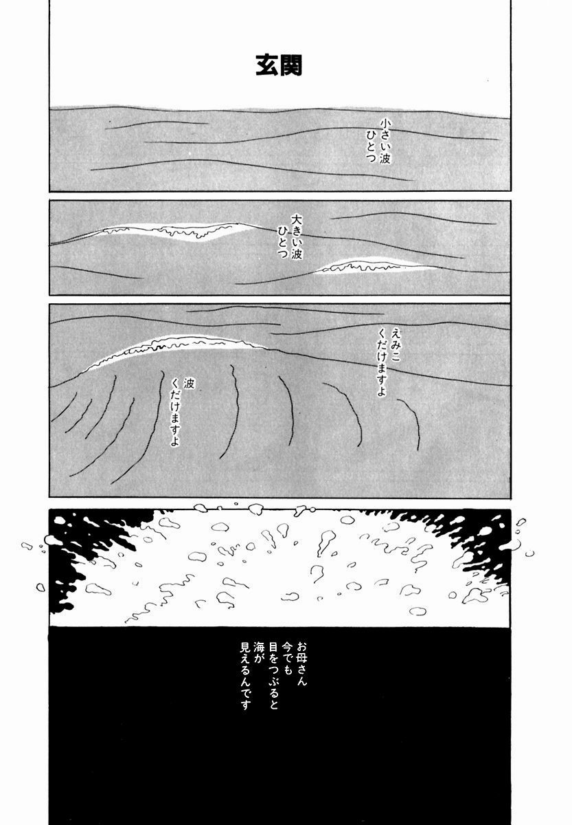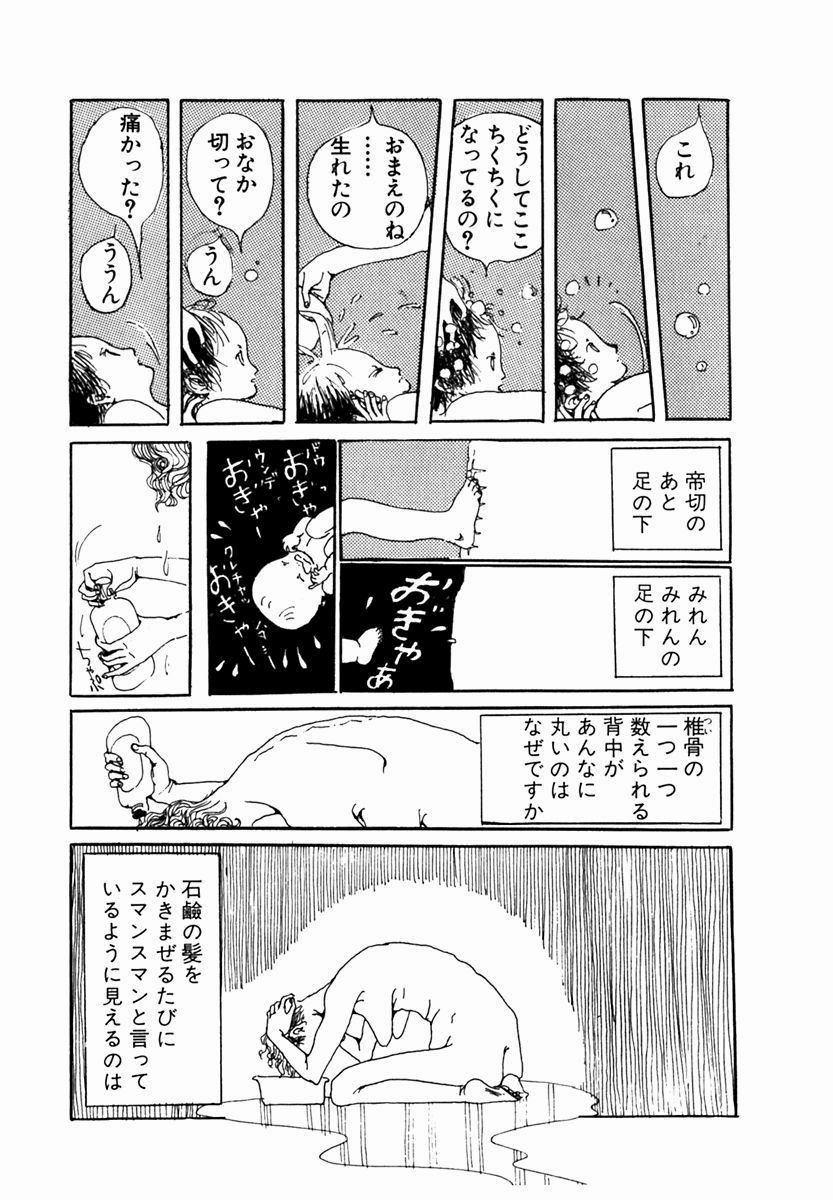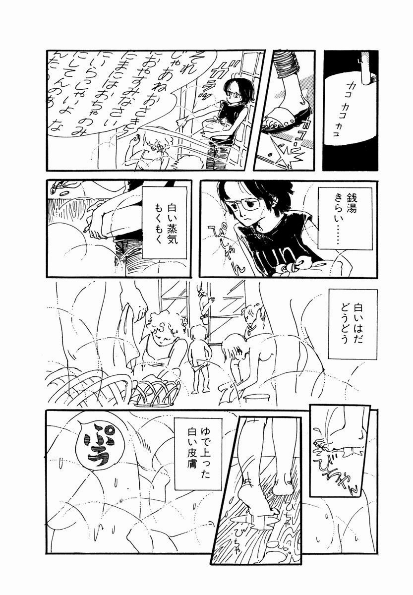 主人公是一个戴眼镜穿着牛仔裤的少女,似乎还患有严重的厌女症。公共浴室里,她意外邂逅了一位老妇,后者让她产生了母亲的错觉,佝偻的背、剖腹产的痕迹…正当少女内心逐步陷入与“母亲”对话时,却被另一个陌生女孩误称为妈妈而打断思绪。作品最后以远去的老妇背影和一句「ツギハ アナタノバンデスヨ」(轮到你了)收尾,成功的制造出了某种“违和感”。本作构图大胆,沿着身体的文字也非常有创意。