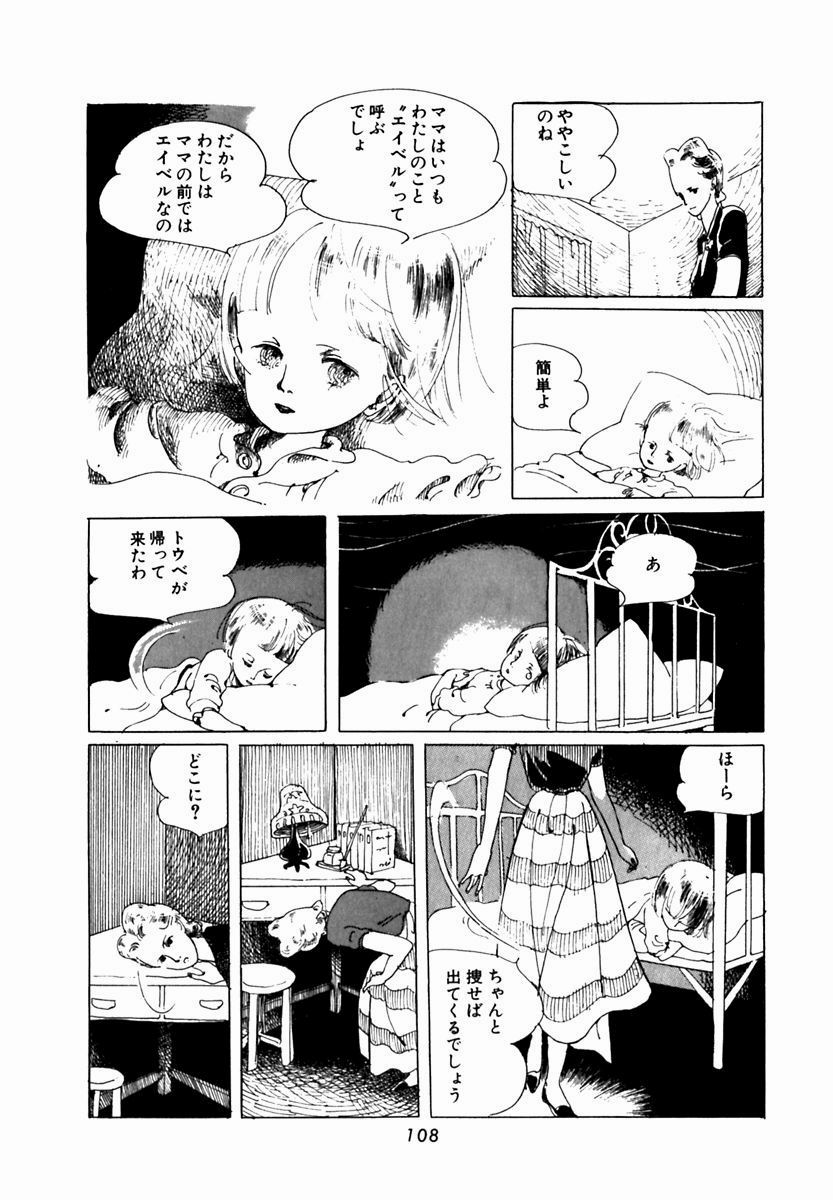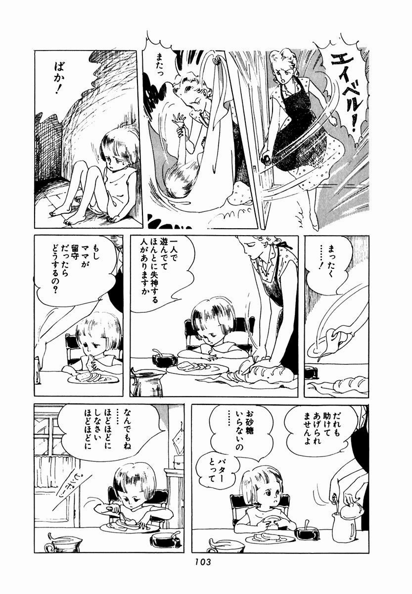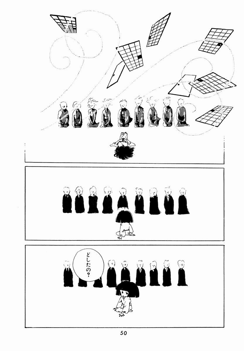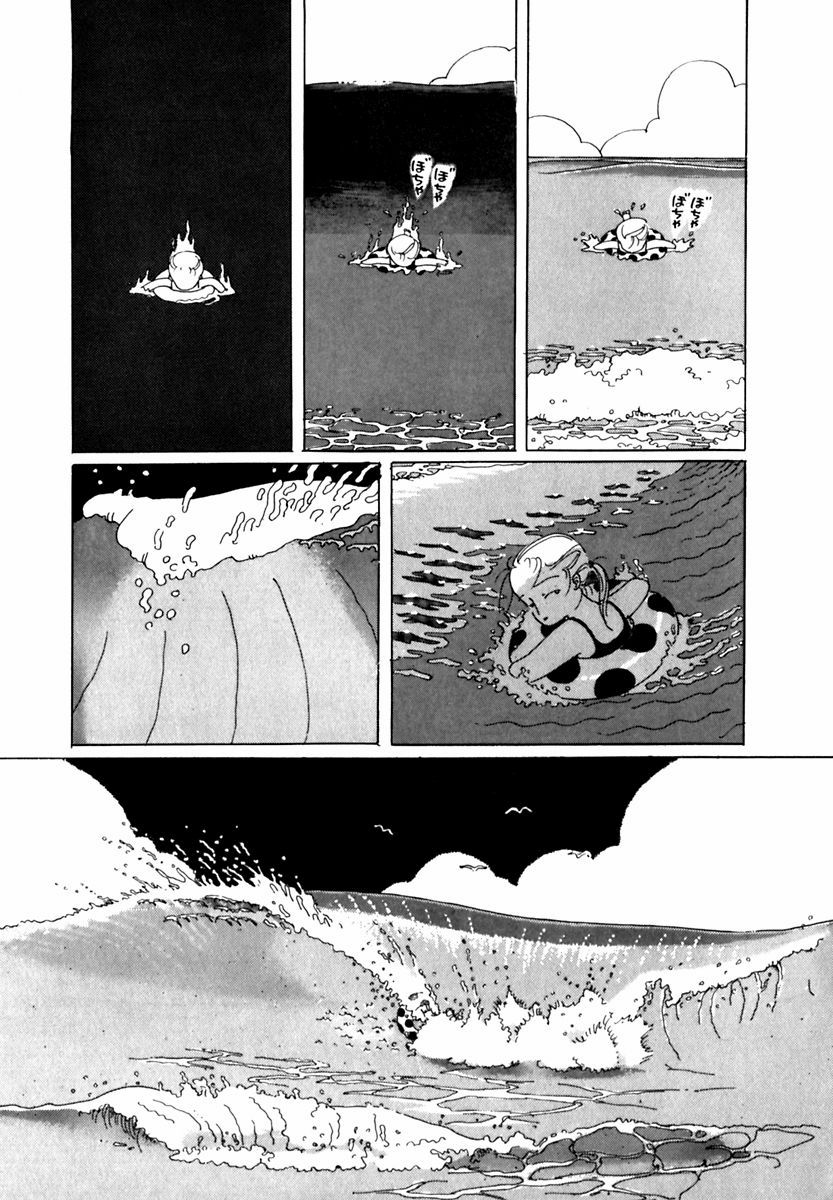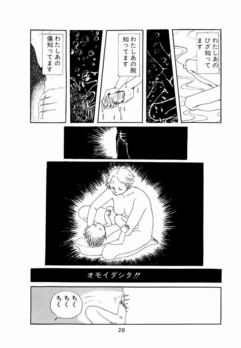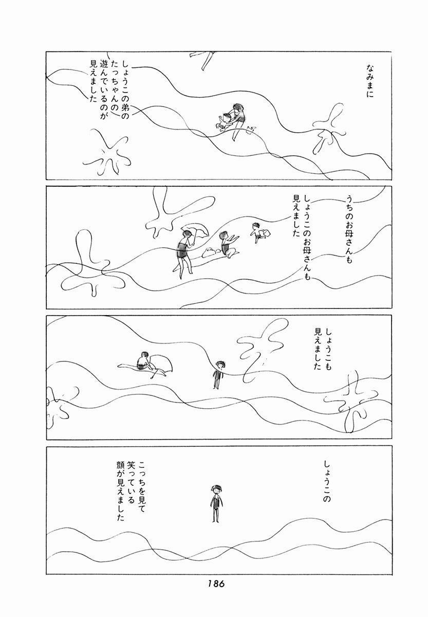 主人公是一个戴眼镜穿着牛仔裤的少女,似乎还患有严重的厌女症。公共浴室里,她意外邂逅了一位老妇,后者让她产生了母亲的错觉,佝偻的背、剖腹产的痕迹…正当少女内心逐步陷入与“母亲”对话时,却被另一个陌生女孩误称为妈妈而打断思绪。作品最后以远去的老妇背影和一句「ツギハ アナタノバンデスヨ」(轮到你了)收尾,成功的制造出了某种“违和感”。本作构图大胆,沿着身体的文字也非常有创意。