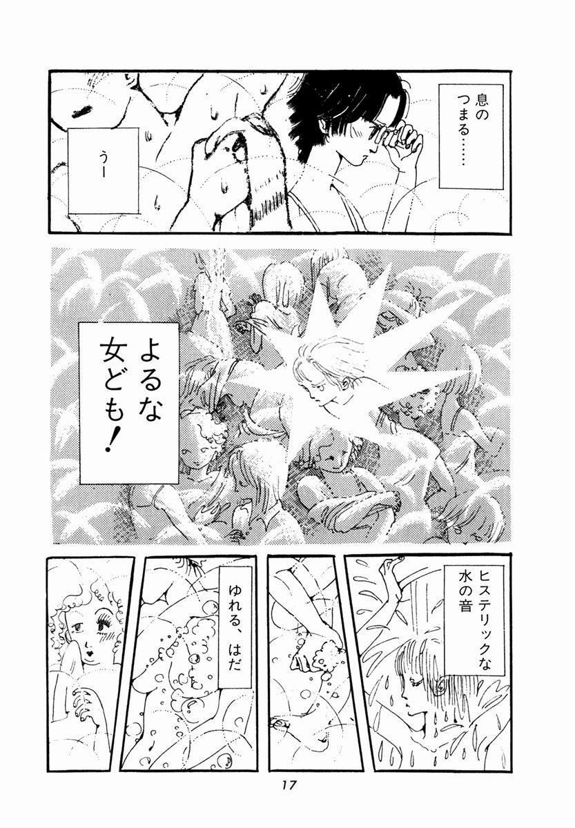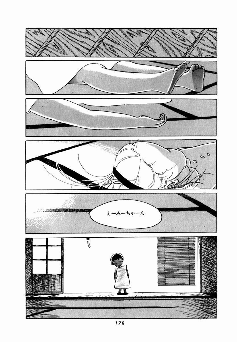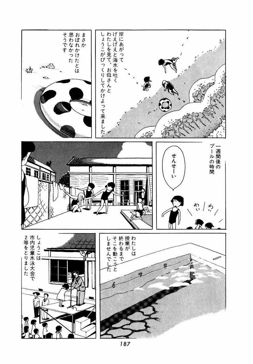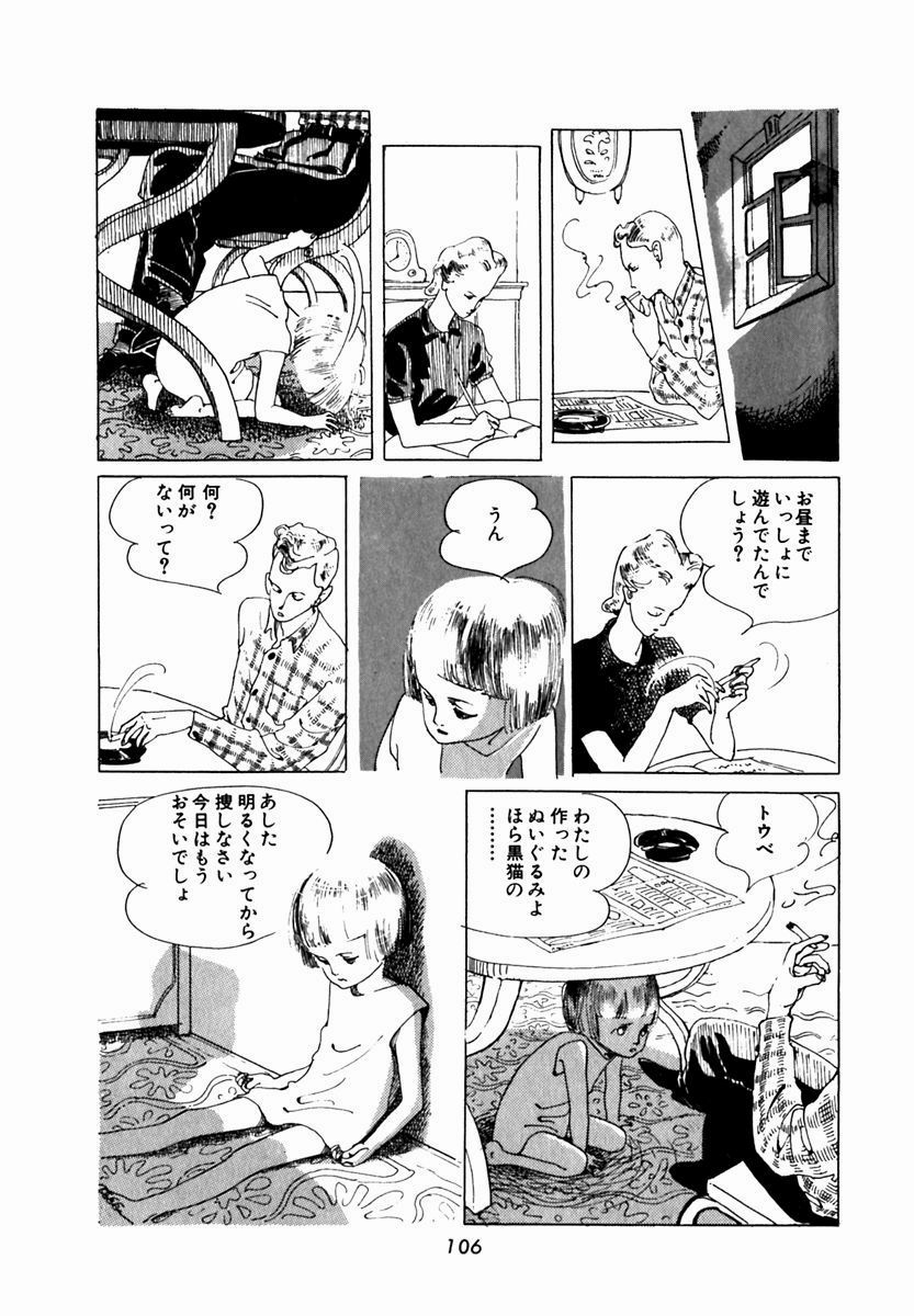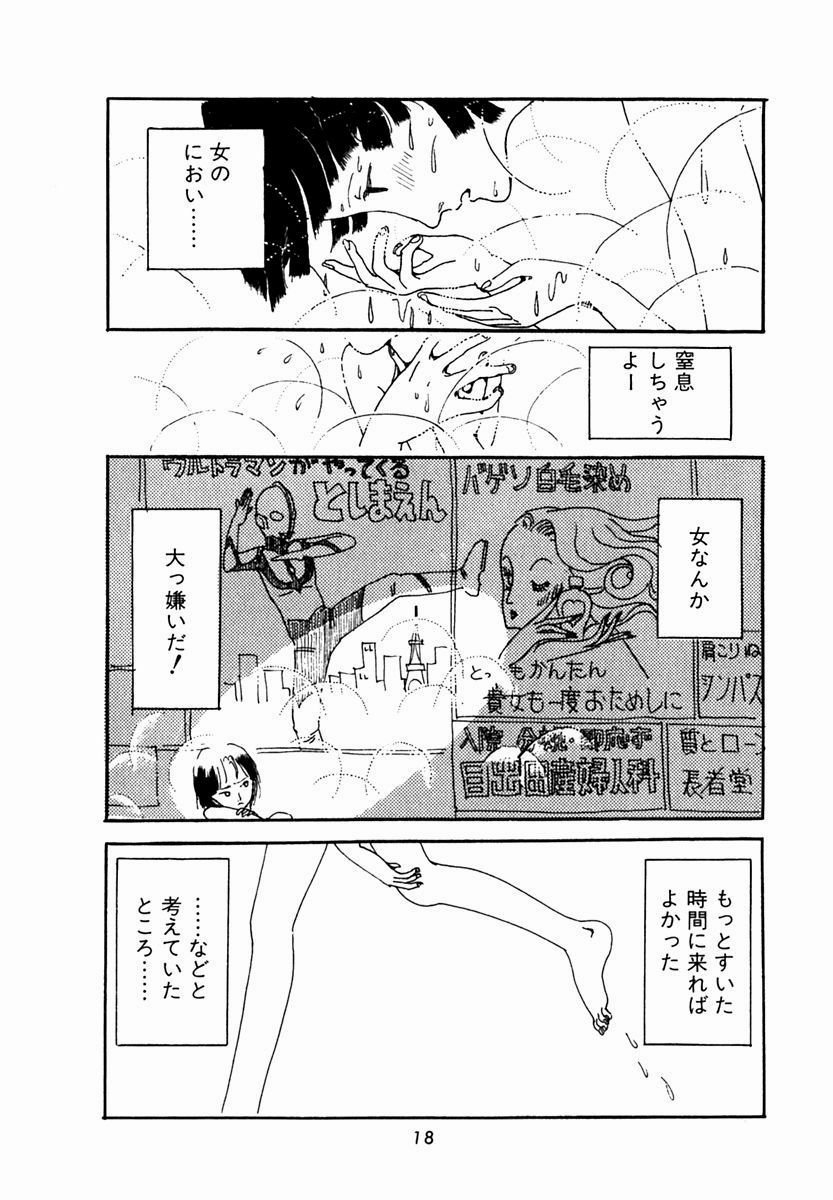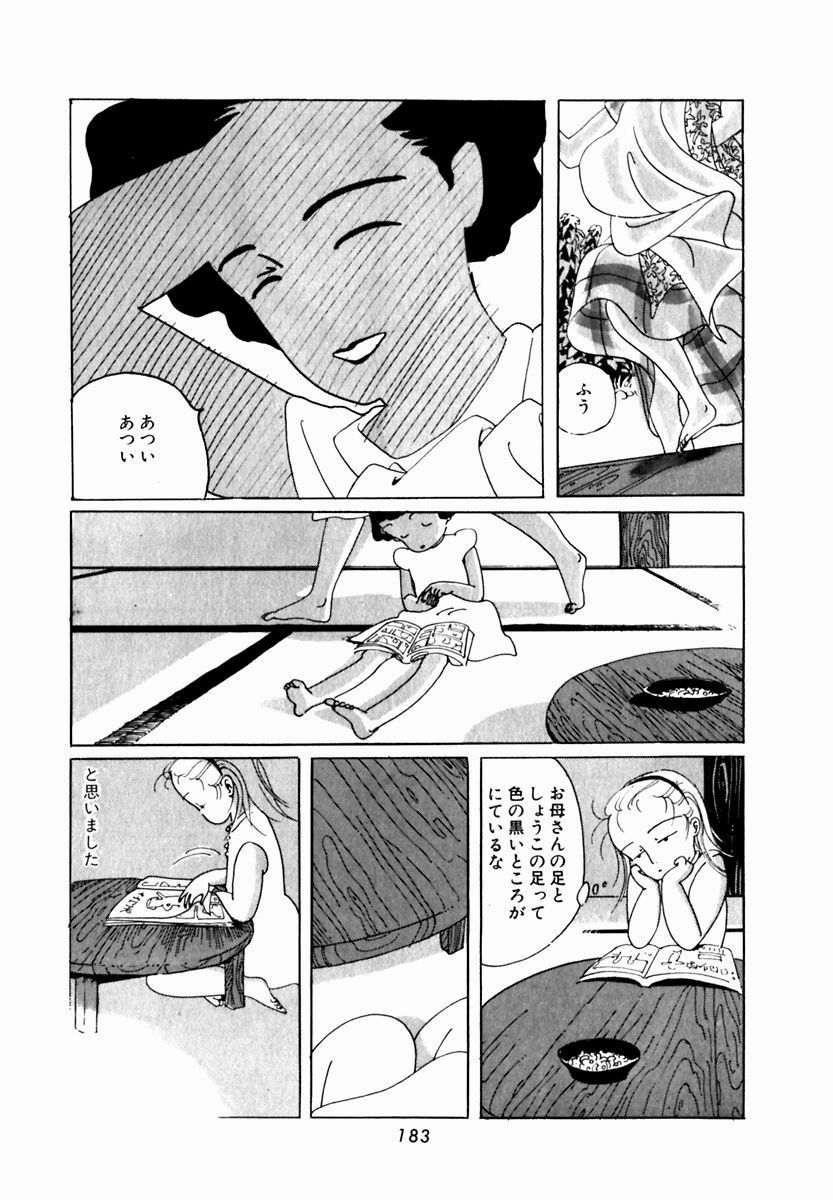 主人公是一个戴眼镜穿着牛仔裤的少女,似乎还患有严重的厌女症。公共浴室里,她意外邂逅了一位老妇,后者让她产生了母亲的错觉,佝偻的背、剖腹产的痕迹…正当少女内心逐步陷入与“母亲”对话时,却被另一个陌生女孩误称为妈妈而打断思绪。作品最后以远去的老妇背影和一句「ツギハ アナタノバンデスヨ」(轮到你了)收尾,成功的制造出了某种“违和感”。本作构图大胆,沿着身体的文字也非常有创意。