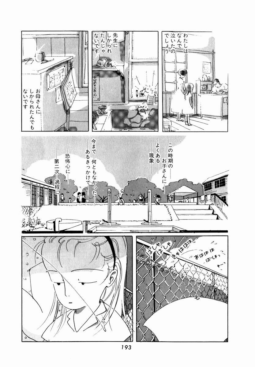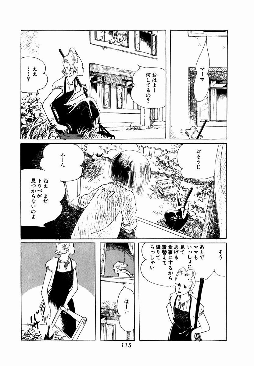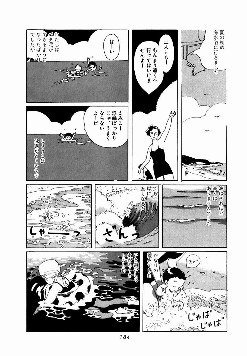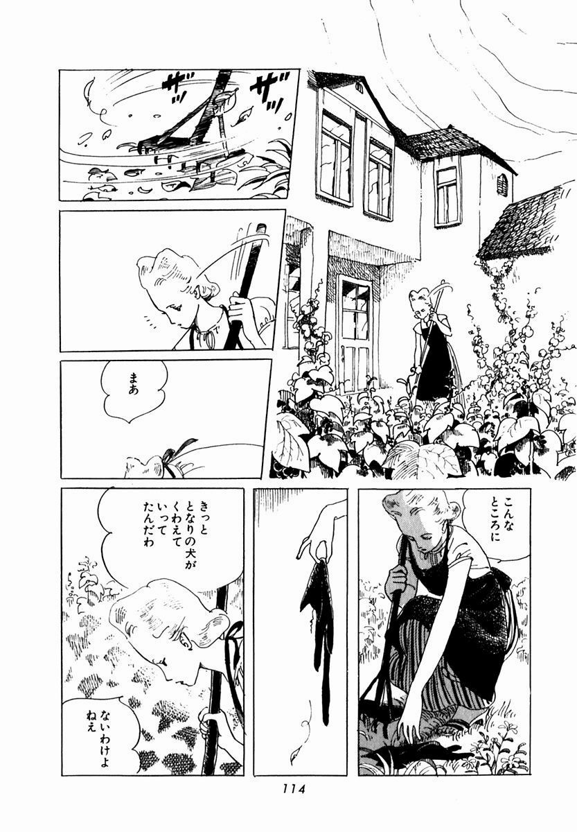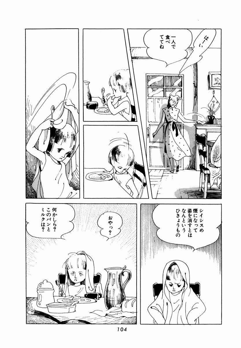主人公是一个戴眼镜穿着牛仔裤的少女,似乎还患有严重的厌女症。公共浴室里,她意外邂逅了一位老妇,后者让她产生了母亲的错觉,佝偻的背、剖腹产的痕迹…正当少女内心逐步陷入与“母亲”对话时,却被另一个陌生女孩误称为妈妈而打断思绪。作品最后以远去的老妇背影和一句「ツギハ アナタノバンデスヨ」(轮到你了)收尾,成功的制造出了某种“违和感”。本作构图大胆,沿着身体的文字也非常有创意。