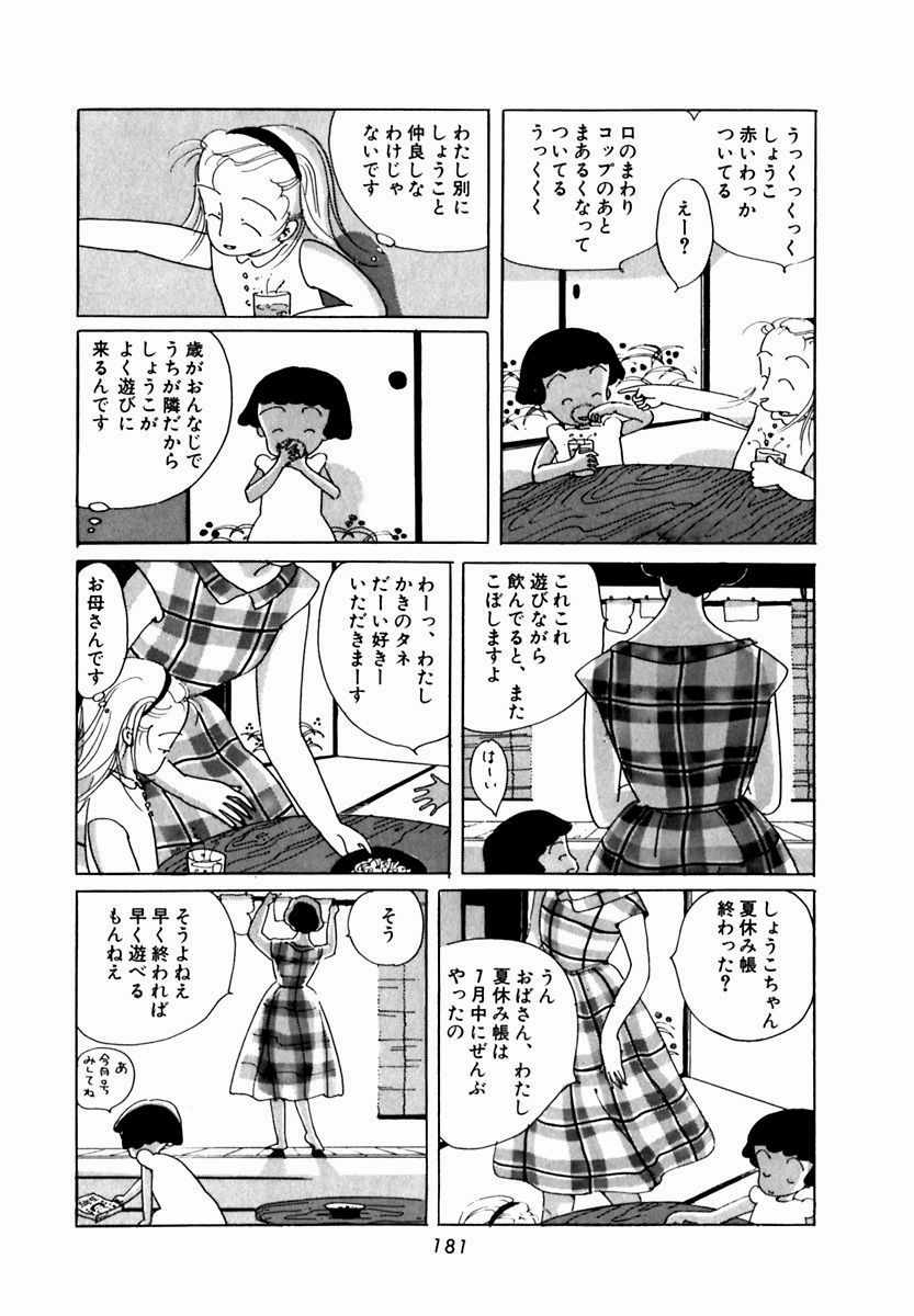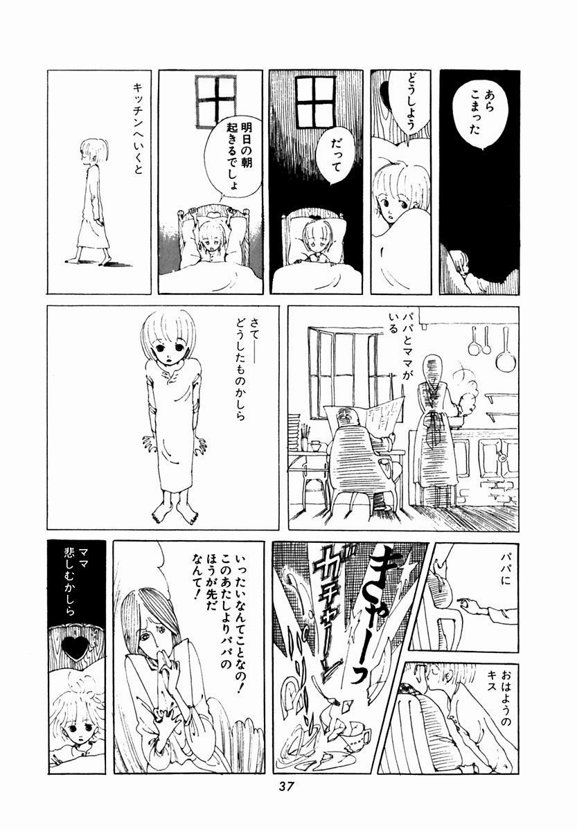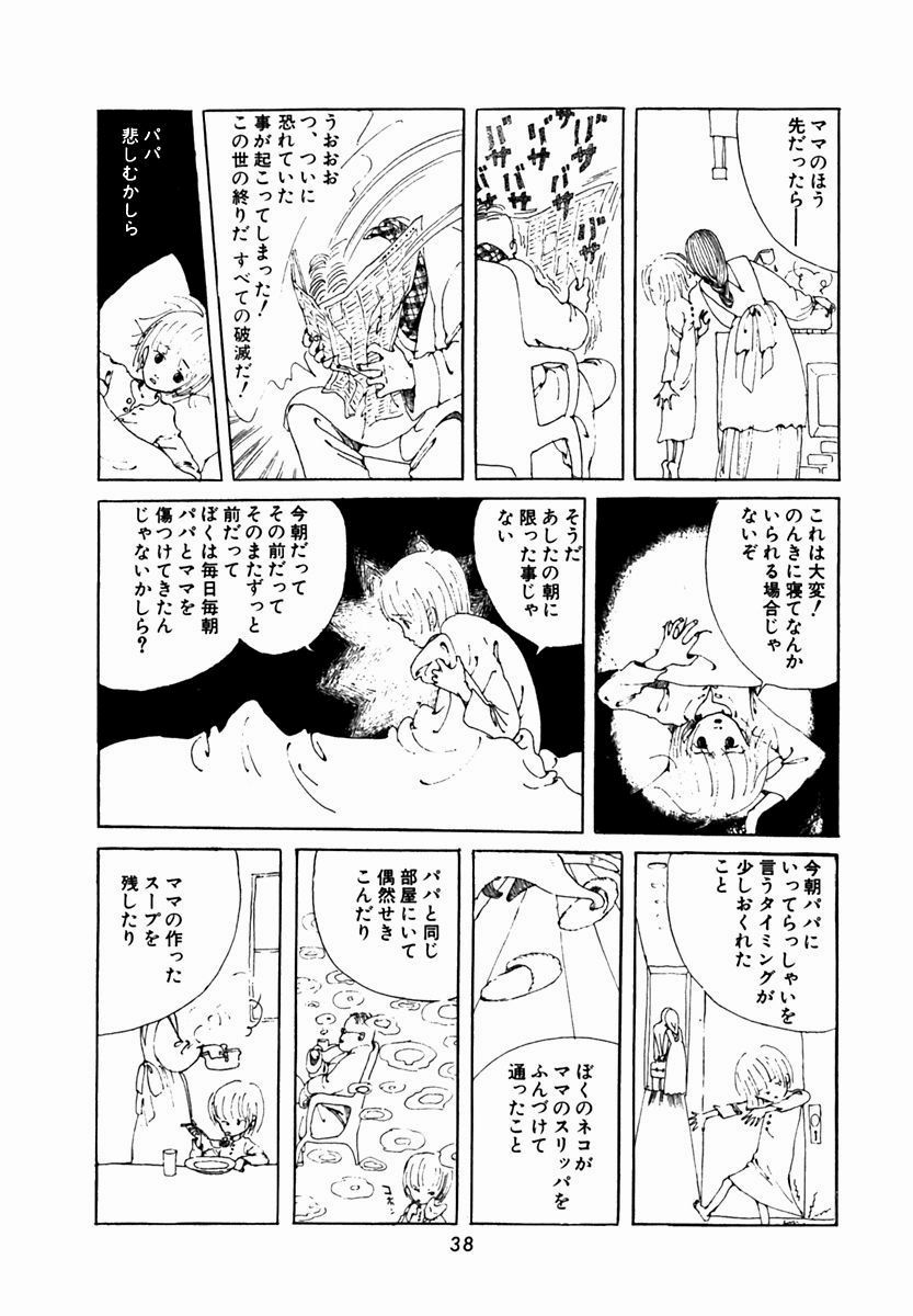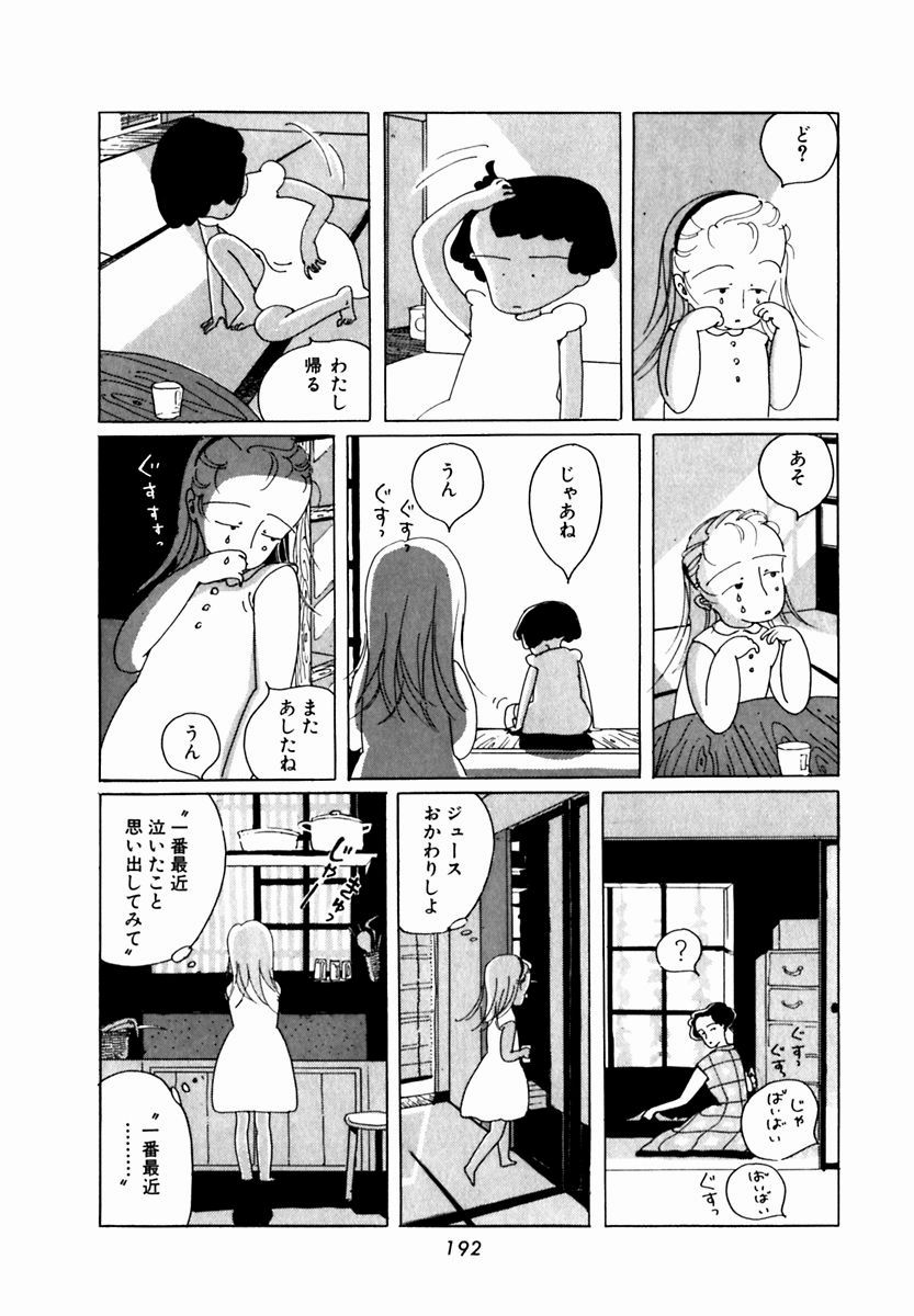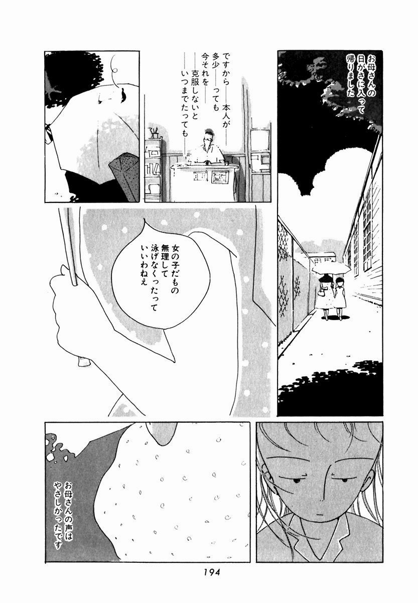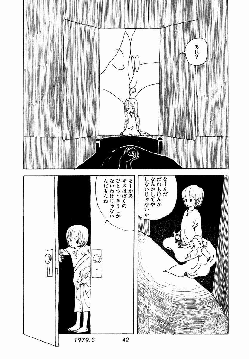 主人公是一个戴眼镜穿着牛仔裤的少女,似乎还患有严重的厌女症。公共浴室里,她意外邂逅了一位老妇,后者让她产生了母亲的错觉,佝偻的背、剖腹产的痕迹…正当少女内心逐步陷入与“母亲”对话时,却被另一个陌生女孩误称为妈妈而打断思绪。作品最后以远去的老妇背影和一句「ツギハ アナタノバンデスヨ」(轮到你了)收尾,成功的制造出了某种“违和感”。本作构图大胆,沿着身体的文字也非常有创意。