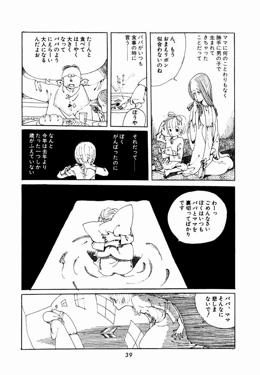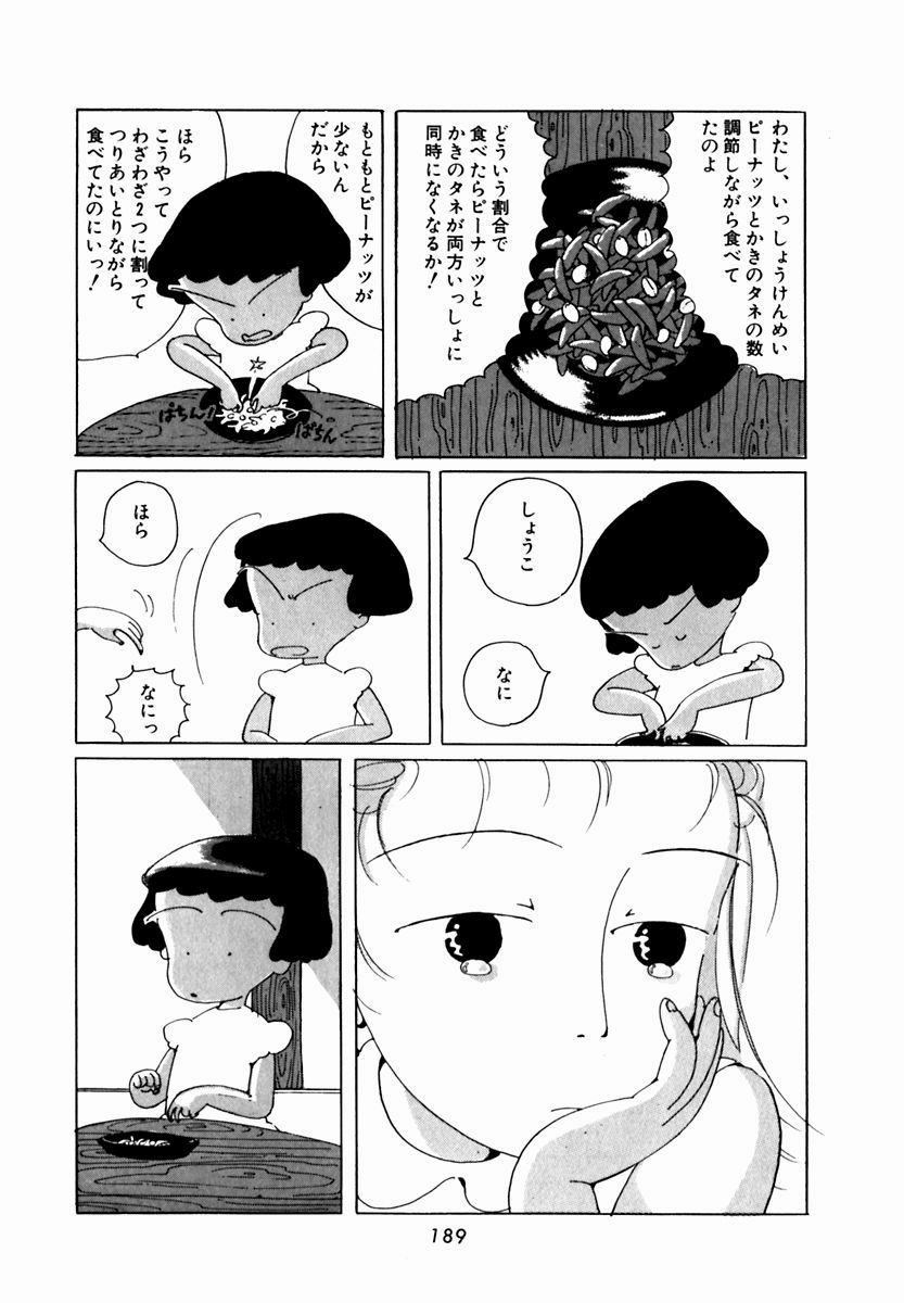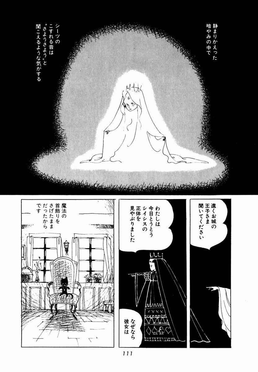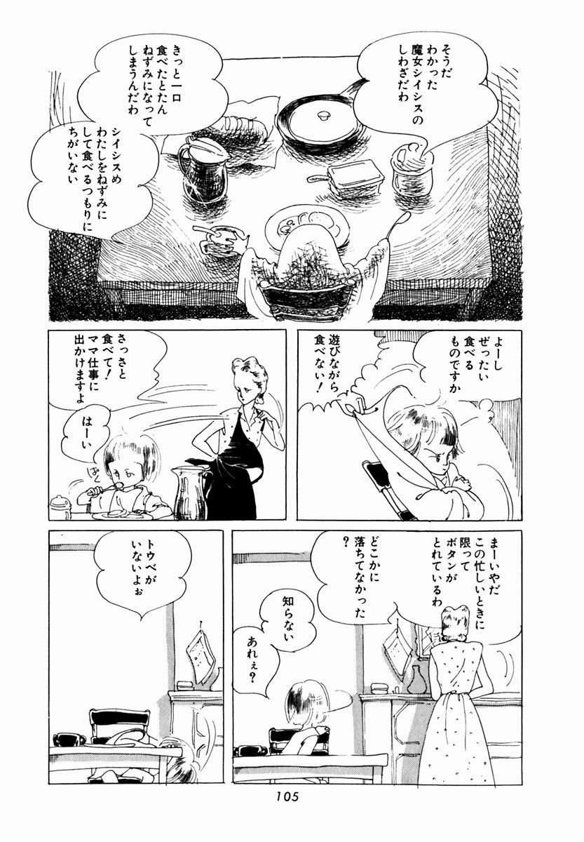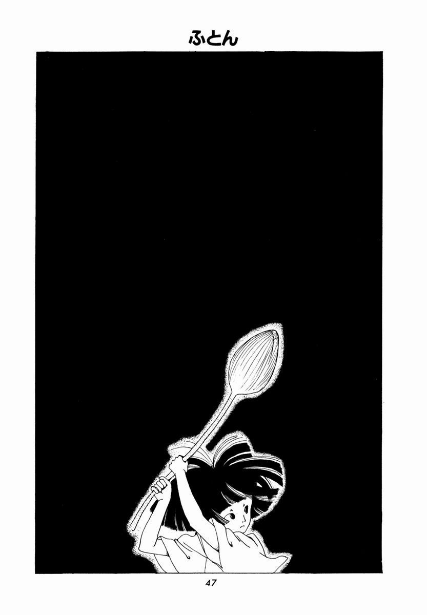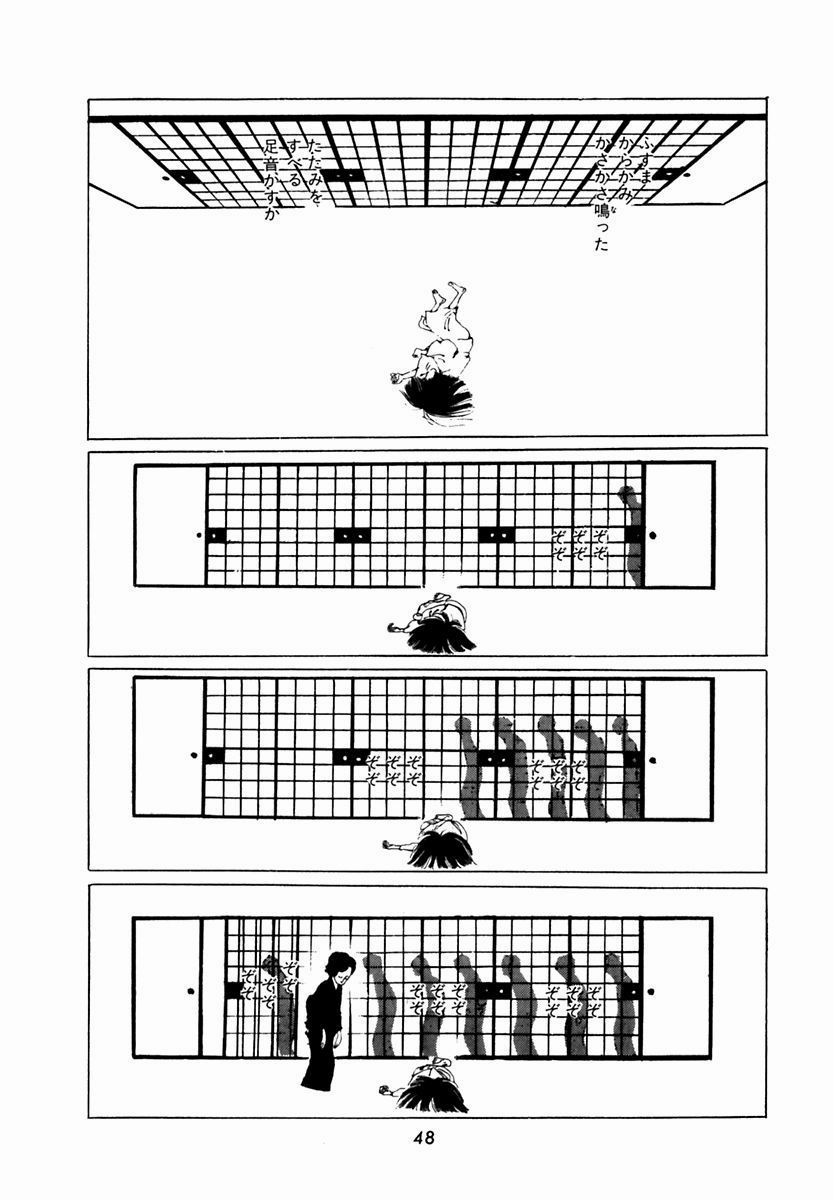 主人公是一个戴眼镜穿着牛仔裤的少女,似乎还患有严重的厌女症。公共浴室里,她意外邂逅了一位老妇,后者让她产生了母亲的错觉,佝偻的背、剖腹产的痕迹…正当少女内心逐步陷入与“母亲”对话时,却被另一个陌生女孩误称为妈妈而打断思绪。作品最后以远去的老妇背影和一句「ツギハ アナタノバンデスヨ」(轮到你了)收尾,成功的制造出了某种“违和感”。本作构图大胆,沿着身体的文字也非常有创意。